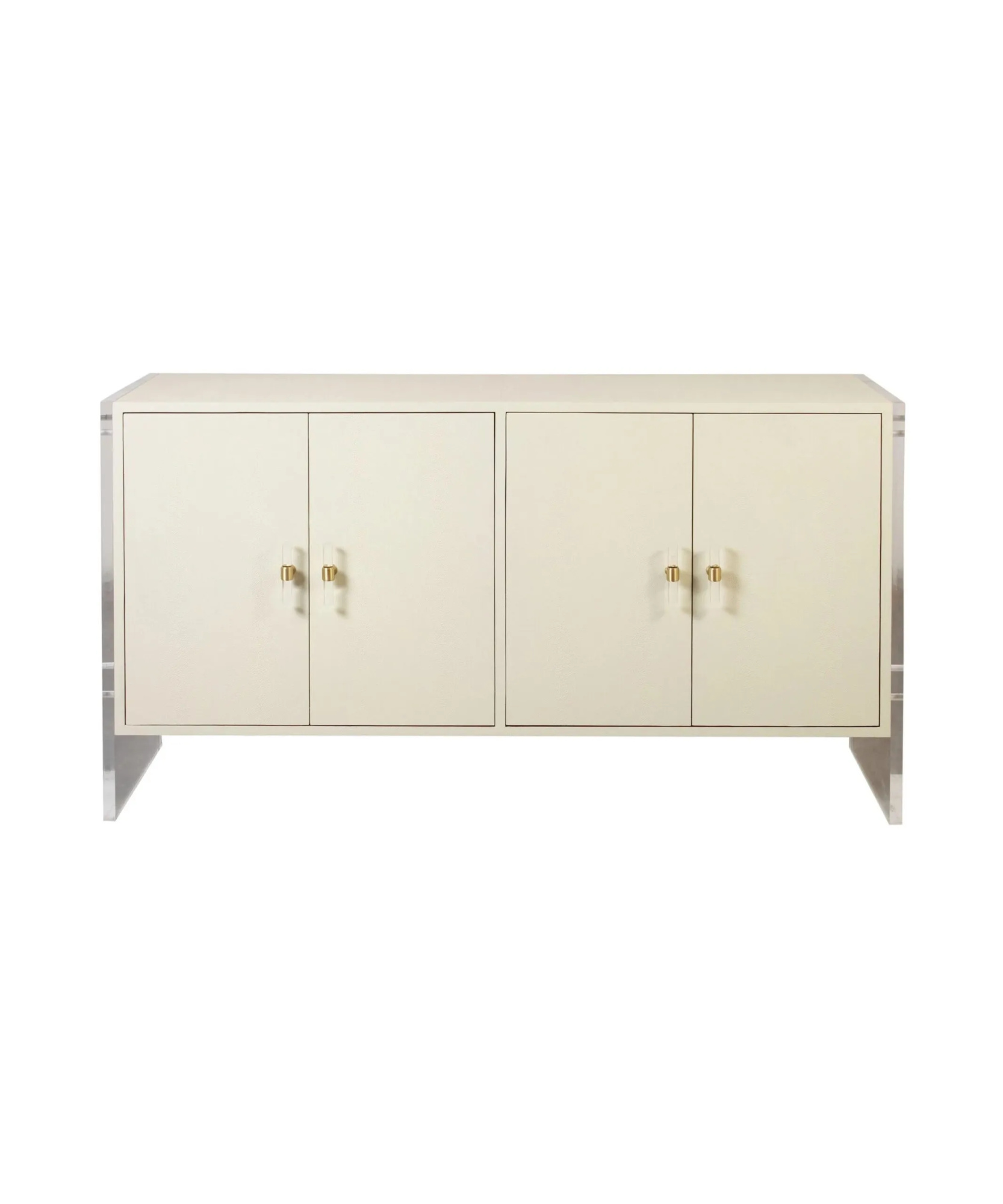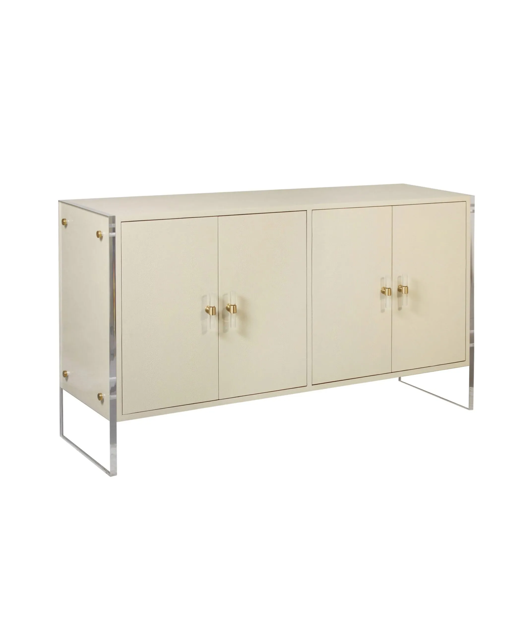 Бежевый комод “Берк” с двумя ящиками, имеет отделку из шагрени, прозрачные акриловые боковые ножки и акцентную металлическую фурнитуру.