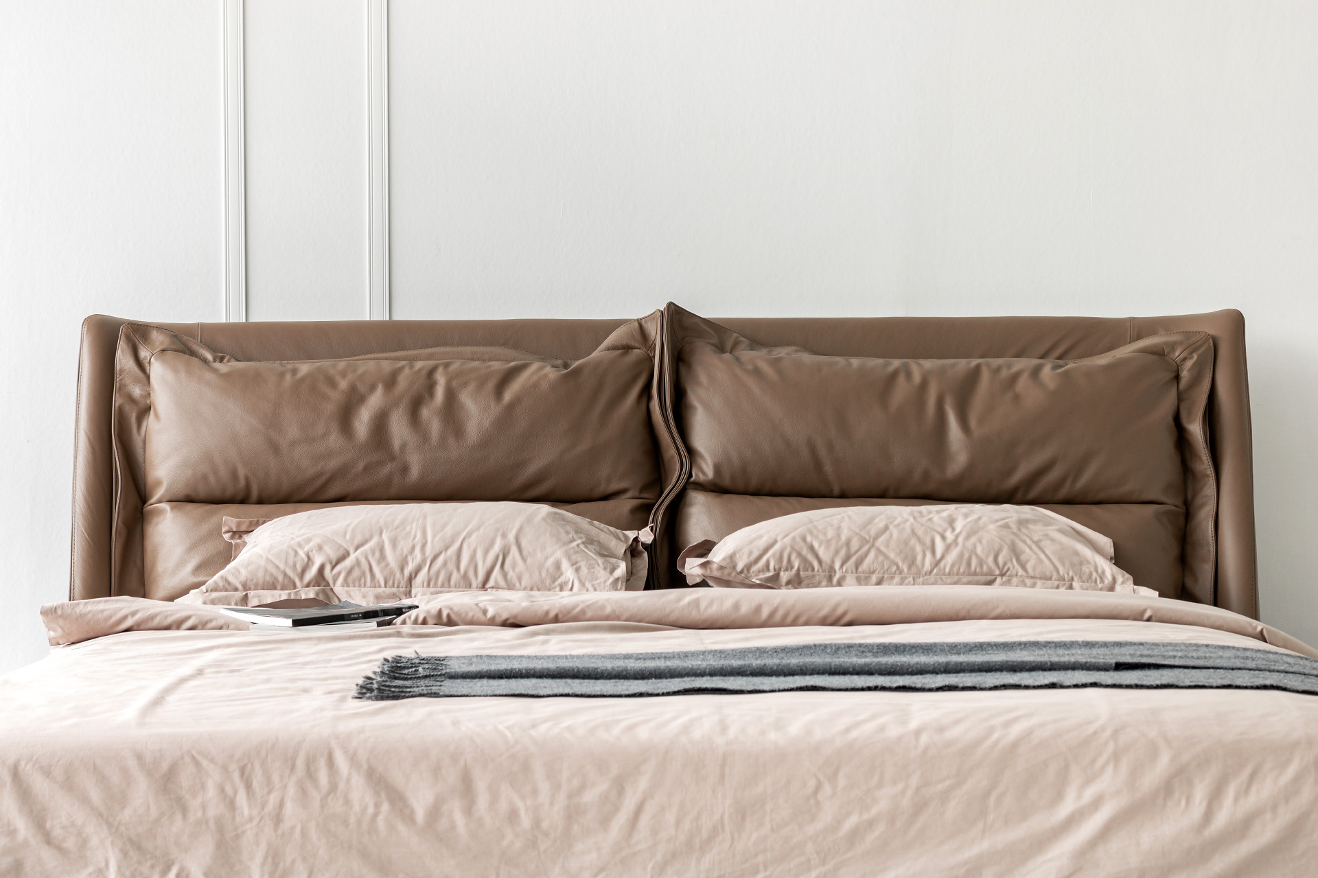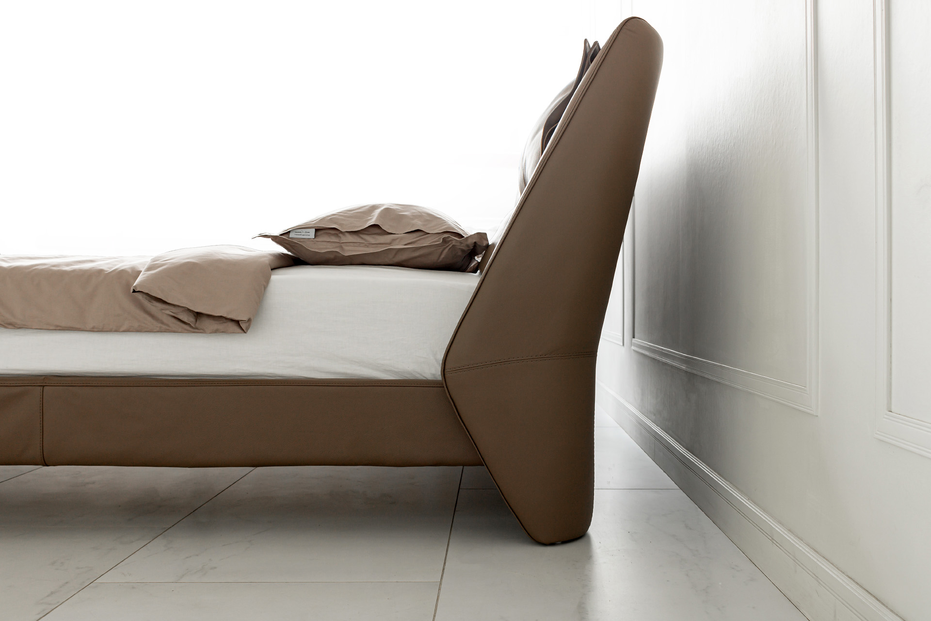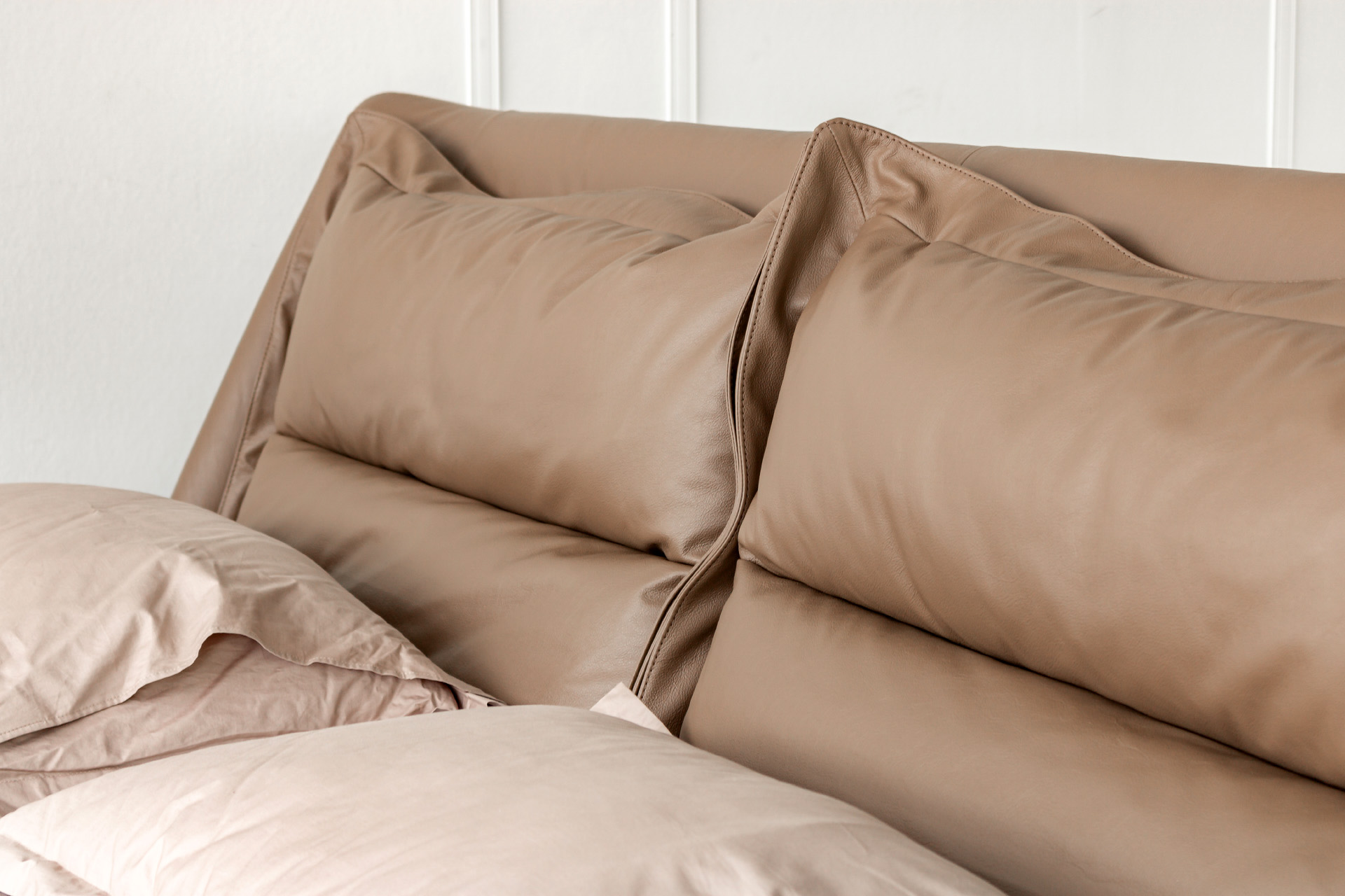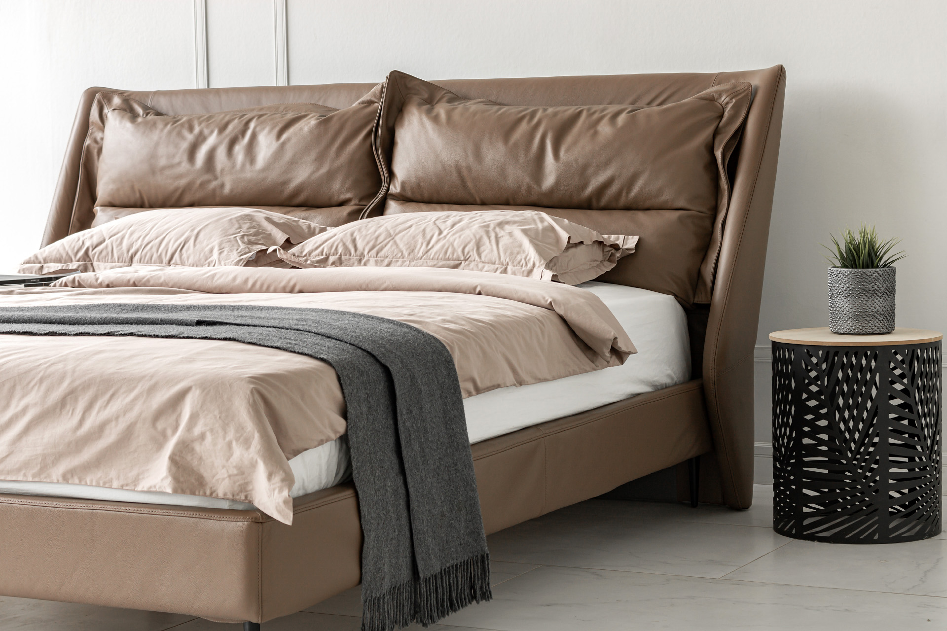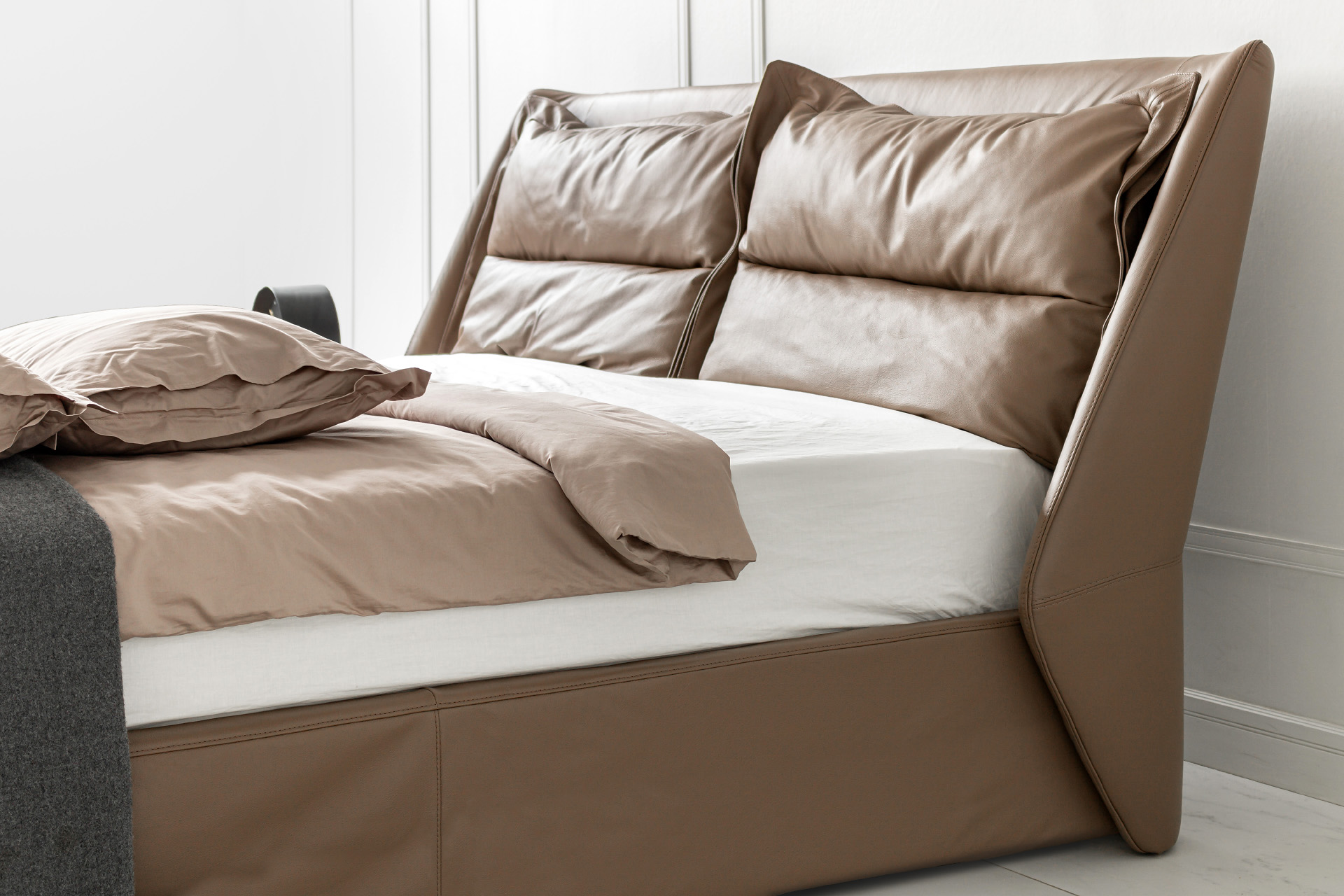 Элегантные формы, плавные переходы между деталями и отсутствие острых углов подчёркивают утончённость образа кровати. Продуманный наклон изголовья и декоративные подушки в комплекте позволяют с комфортом разместиться для чтения книги или просмотра любимого фильма перед сном.