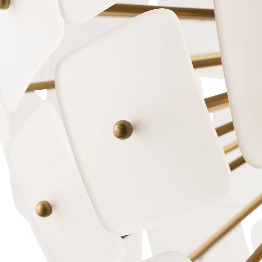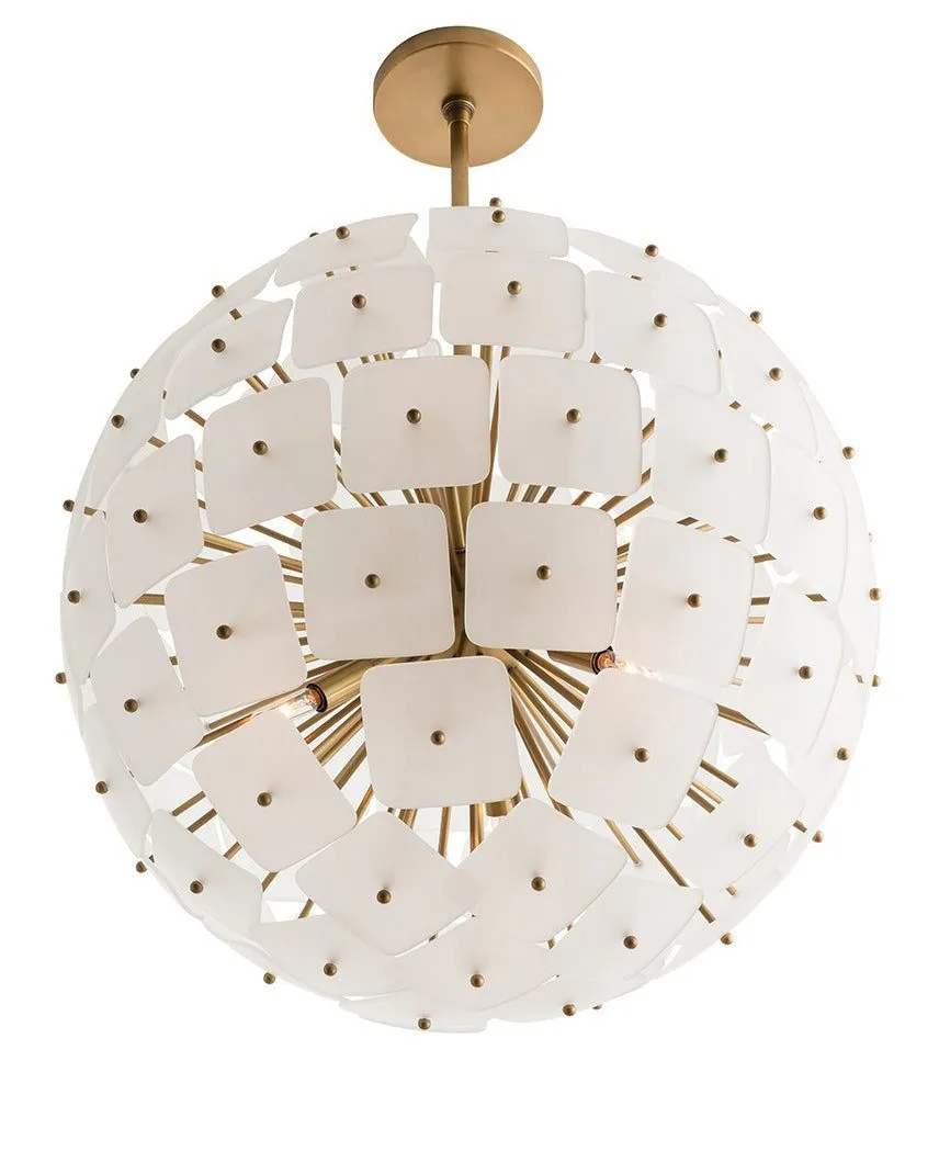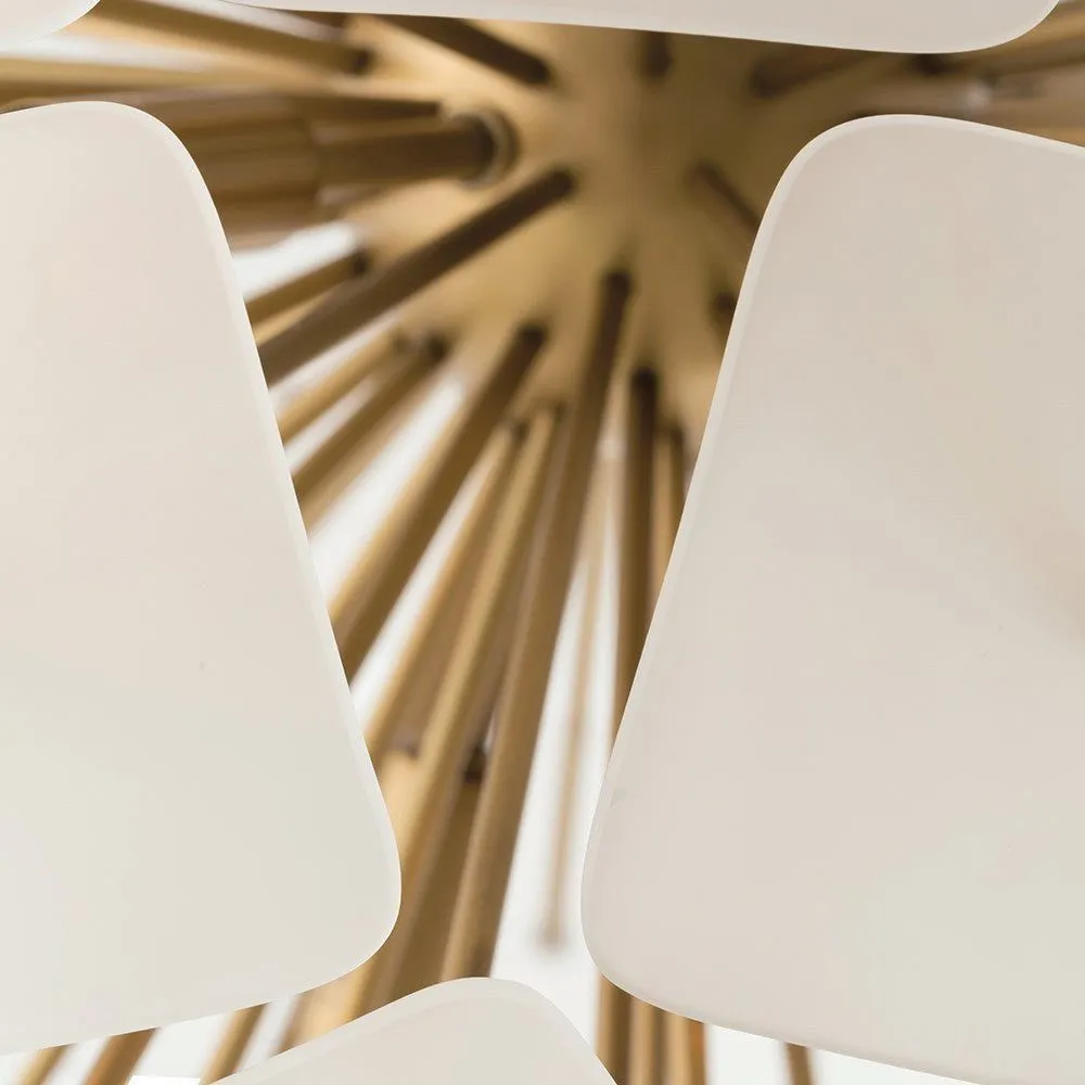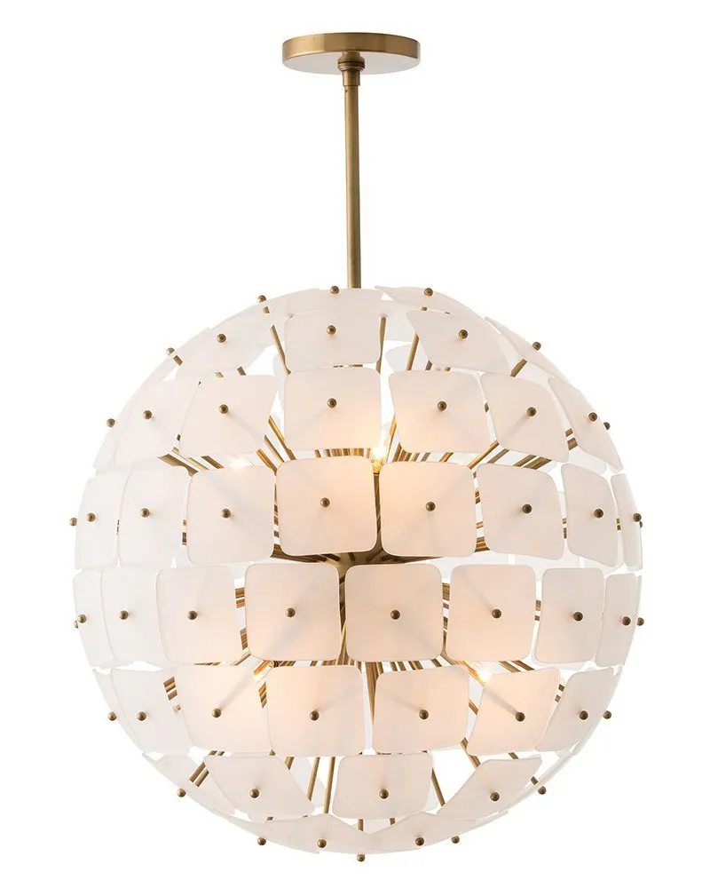 Современный стиль люстры "Бертрам" в форме шара, которая имеет шесть ламп и обеспечивают красивое окружающее освещение благодаря квадратным матовым стеклянным дискам, прикрепленным к металлическим стержням золотого цвета.Количество ламп: 6 шт. Тип цоколя: E14. Мощность лампы: 60W. Общая мощность : 360W