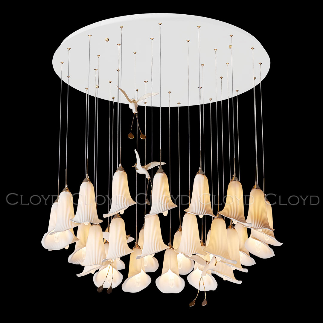 Люстра подвесная Cloyd OSANNA (Клойд Осанна) C29 / арт.11891, ø: 100 см. высота: 110 см, источник света: E14 х 29 шт, цвет металла - белый (окраска). Фурнитура - золото. Особенности: керамика высокого качества, птица выполнена из фарфора.Гарантия: 1 год.
