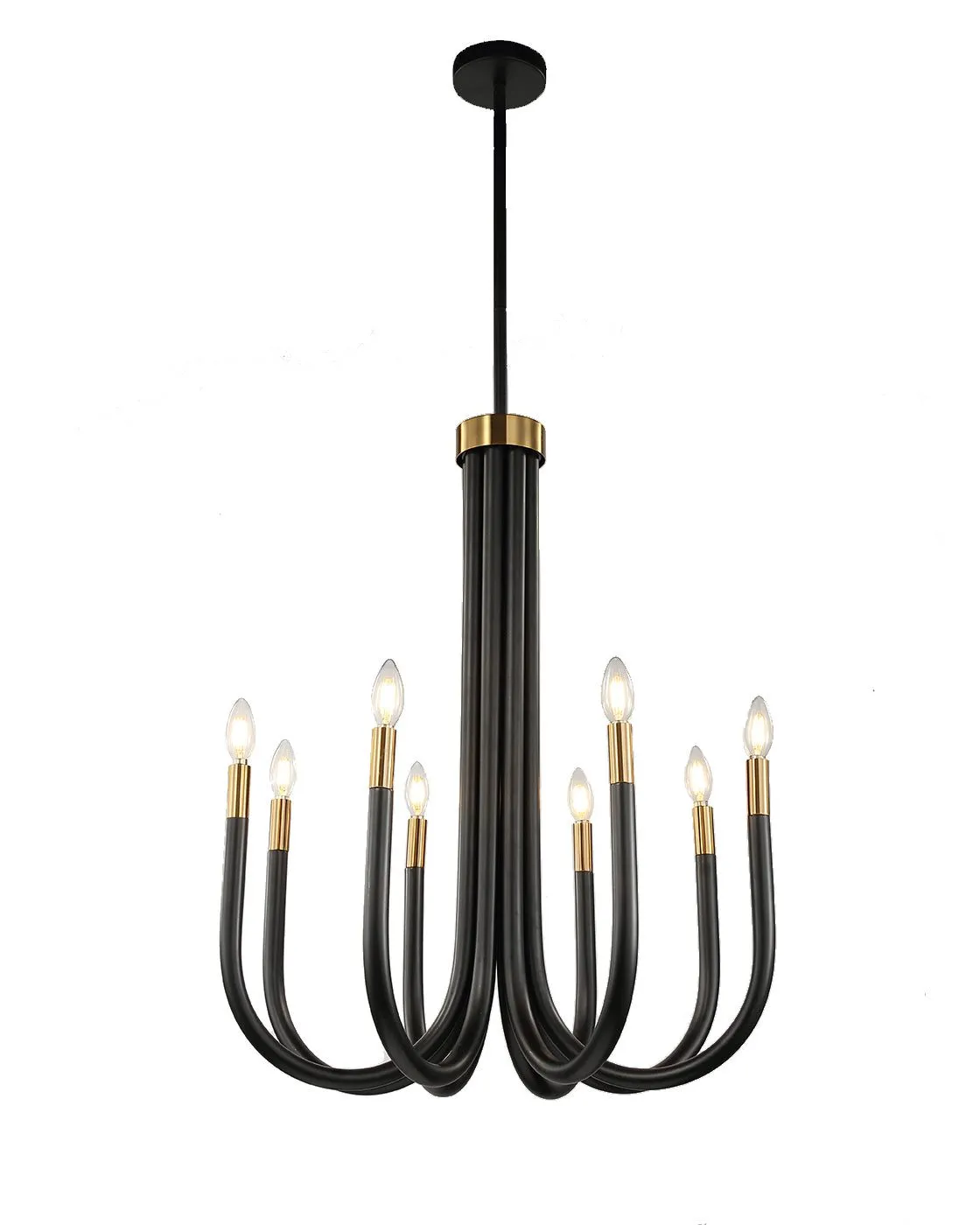 Современная люстра "Оттава" в строгом черном цвете, имеет изящно изогнутые к верху рукава с латунными вставками. Количество ламп: 8шт. Тип цоколя: E14. Мощность лампы: 40W. Общая мощность : 320W