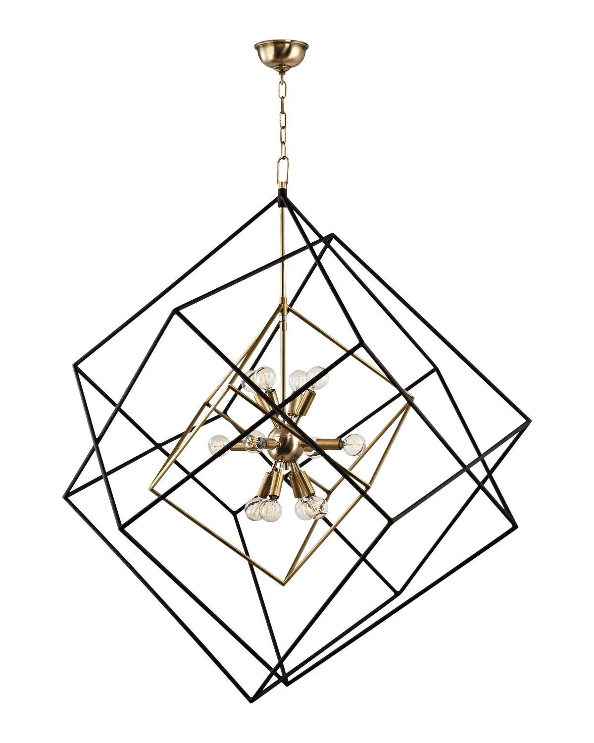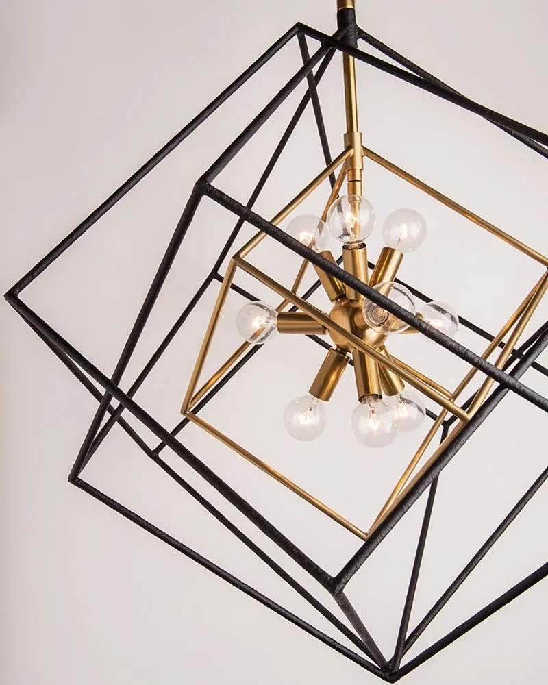 Кувыркающиеся кубики, застывшие в движении, окружают современный световой кластер. Черное железо с инертной текстурой контрастирует с золотистой металлической отделкой внутри. Эта люстра выглядит очень современно, напоминая о атомной эре, прославляя напряжение, которое удерживает вселенную и атом в идеальном месте. Количество ламп: 9 шт. Тип цоколя: E14. Мощность лампы: 60W. Общая мощность : 540W