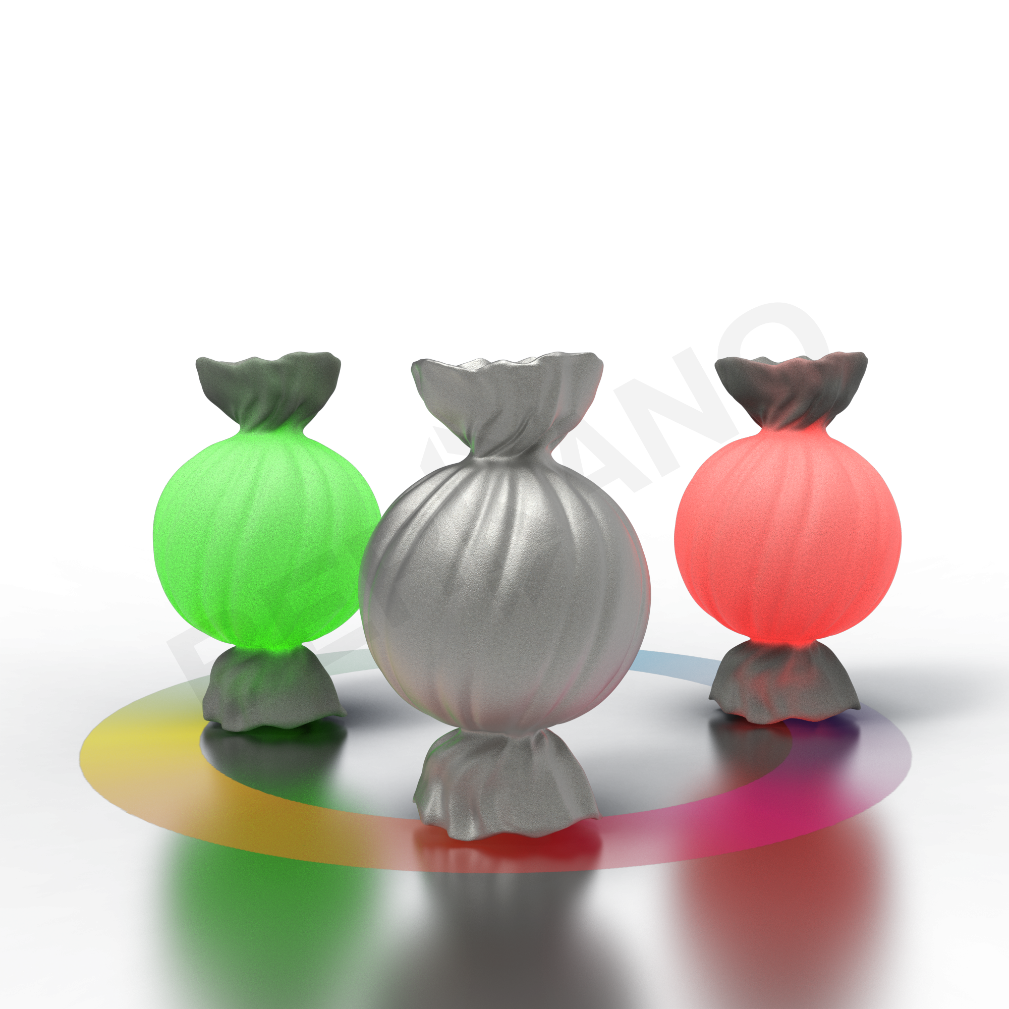 CANDY ROUND — это объёмная конфета, «завёрнутая» в скрученную обёртку, выполненная из белого матового пластика с плавными изогнутыми линиями. Центральная часть конфеты - крупная, почти сферическая, с выразительными продольными рельефами. Эти волнообразные полосы придают телу конфеты динамику, делают её визуально «вкусной» и насыщенной.