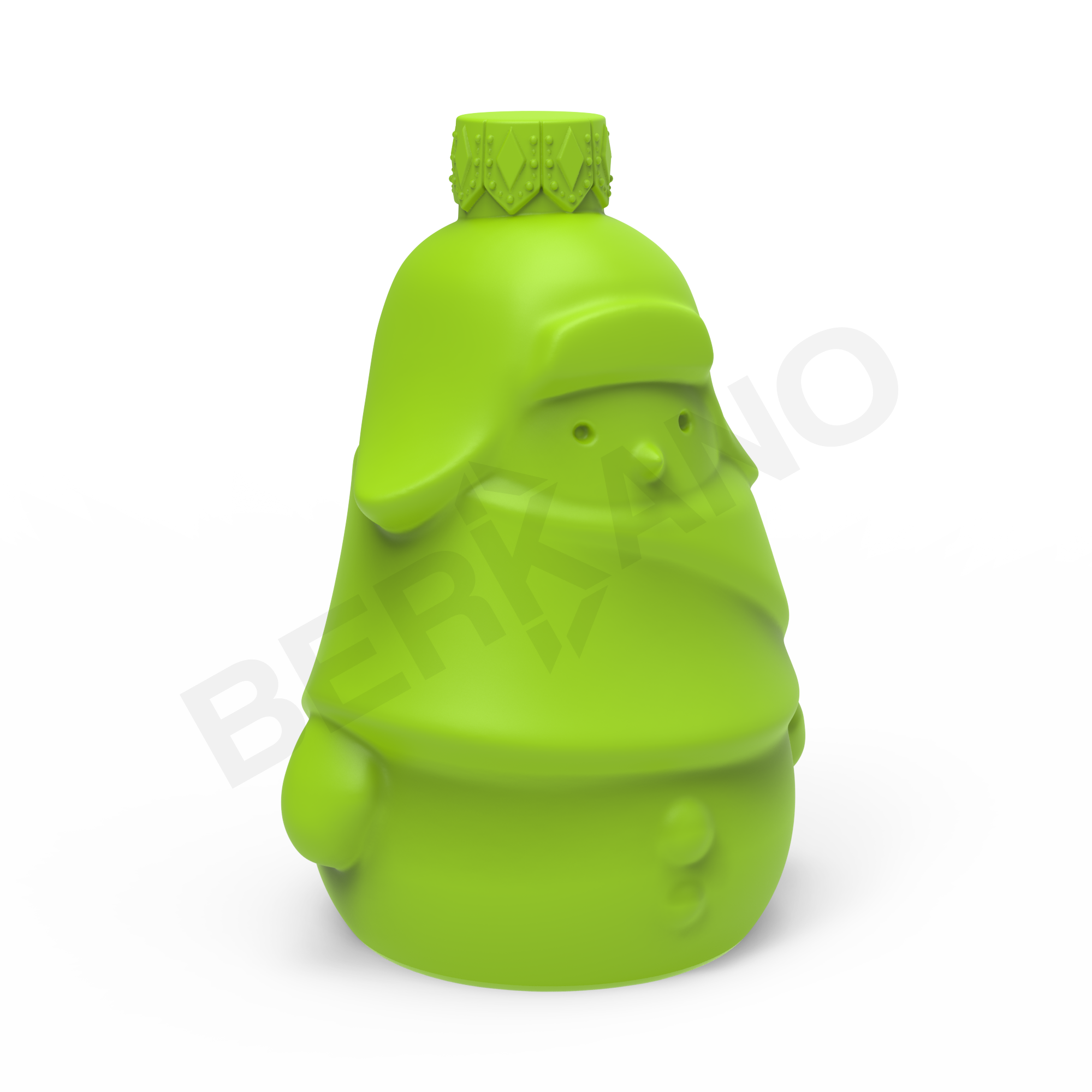 Образ построен на мягких линиях, округлых силуэтах и лаконичном рельефе - это современная трактовка зимнего персонажа, близкая к анимационному стилю. Голова плавно переходит в тело, создавая цельную каплевидную форму. Снеговик носит крупную шапку-ушанку с опущенными «ушами» и широким отворотом - она визуально задаёт настроение: уютное, немного ностальгическое. На корпусе прорисованы объёмный шарф, плотно обёрнутый вокруг фигуры, и две рельефные пуговицы на животе. Ручки отведены по бокам, придавая игрушке симметрию.