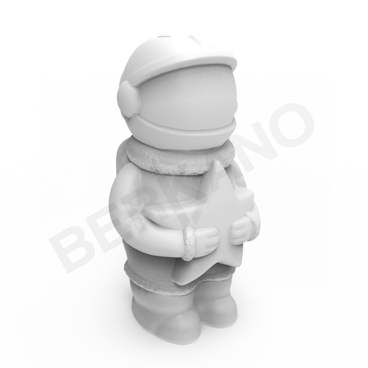 Детализированная форма и шлем создают ассоциации с современным образом исследователя космоса. Фигура с чётко прорисованным скафандром: округлый шлем с гладкой лицевой частью, торс, рельефные шланги и детали костюма. Все линии пластичны, пропорции гармоничны. Особое внимание привлекает деталь: в руках космонавт держит пятиконечную звезду, словно символ мечты, цели или найденного света.