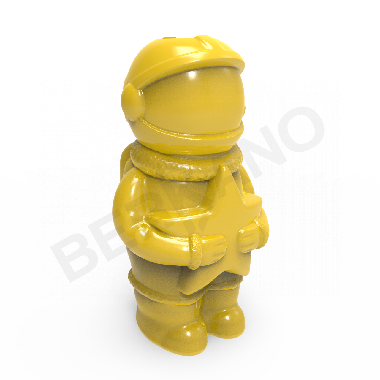 Детализированная форма и шлем создают ассоциации с современным образом исследователя космоса. Фигура с чётко прорисованным скафандром: округлый шлем с гладкой лицевой частью, торс, рельефные шланги и детали костюма. Все линии пластичны, пропорции гармоничны. Особое внимание привлекает деталь: в руках космонавт держит пятиконечную звезду, словно символ мечты, цели или найденного света.
