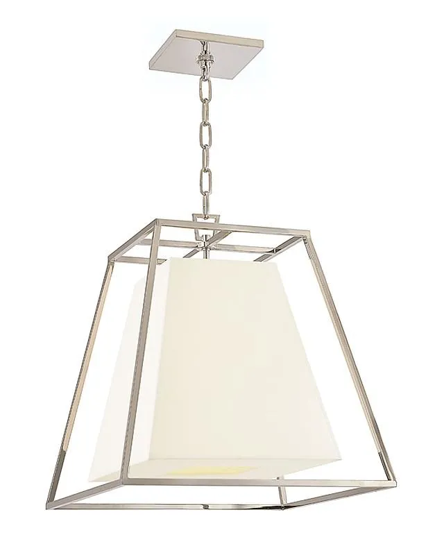 Стильная люстра "Пегги" с каркасом в серебряном цвете и абажуром белого цвета. Трапециевидный абажур заключен в металлическую раму. Открытое пространство между совпадающими формами подчеркнет красоту современного стиля этого осветительного прибора в любом пространстве Вашего дома.Длина цепи : 90 см. Длина провода: 120 см. Количество ламп: 4 шт. Тип цоколя: . Мощность лампы: 60W. Общая мощность : 240W