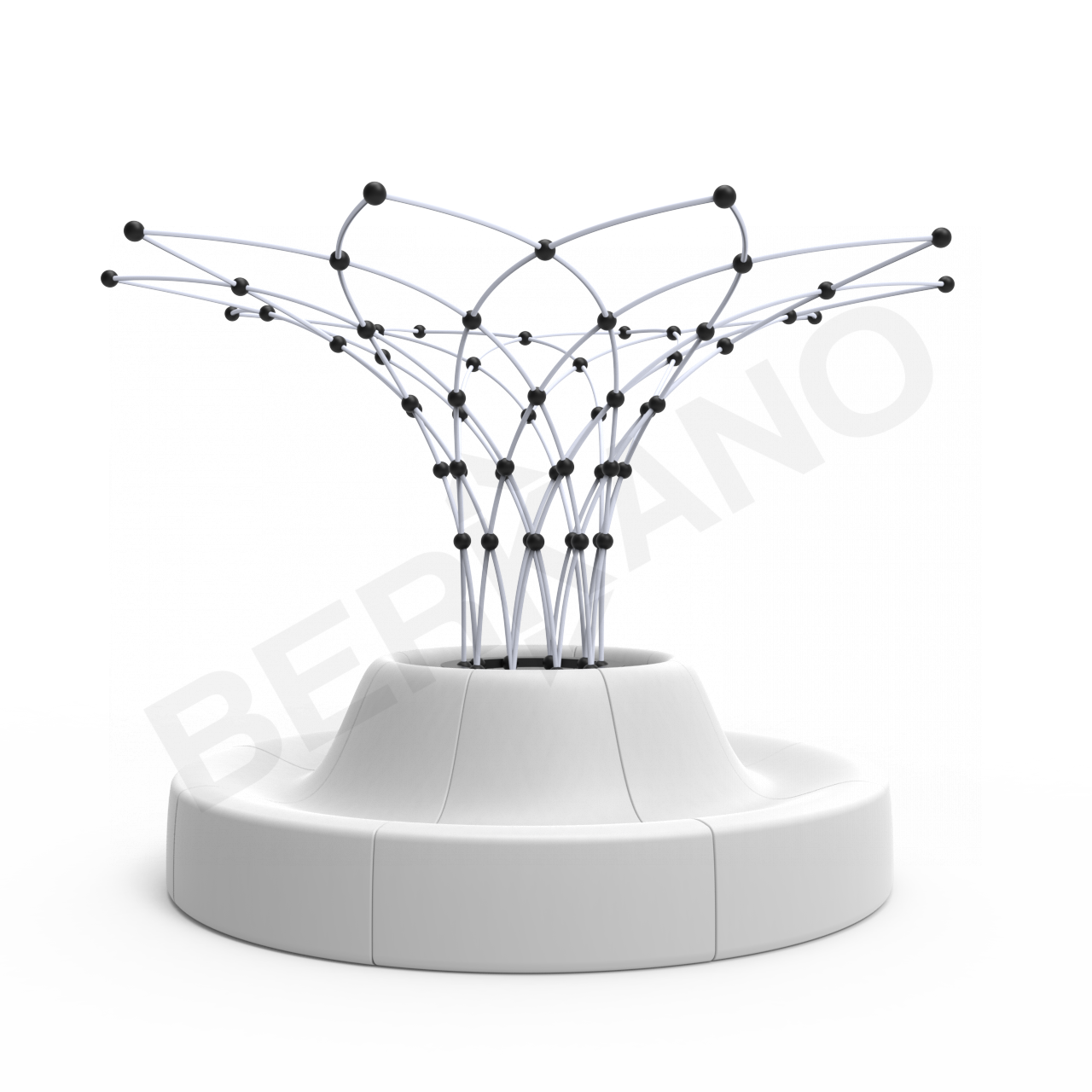 Широкое основание одновременно выполняет роль посадочного места и опоры для живой конструкции. Вьющиеся растения, поднимаясь по каркасу, формируют естественный навес, создающий тень и визуально оживляющий пространство.
