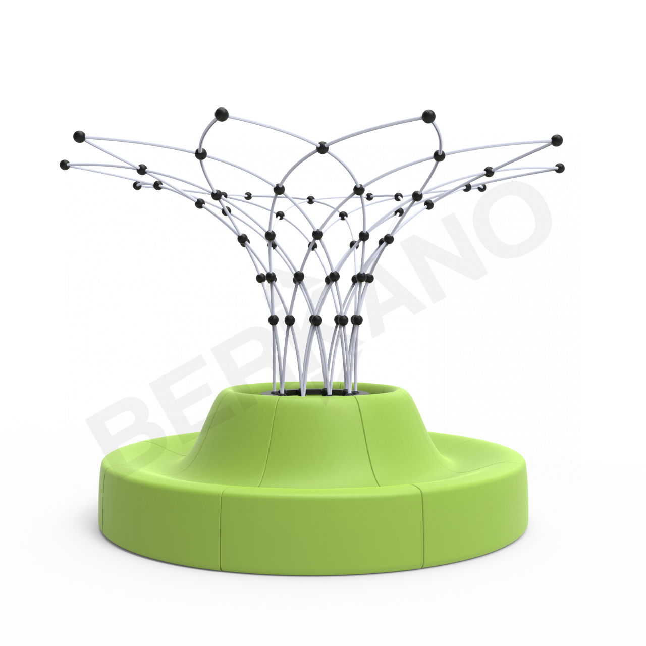 Широкое основание одновременно выполняет роль посадочного места и опоры для живой конструкции. Вьющиеся растения, поднимаясь по каркасу, формируют естественный навес, создающий тень и визуально оживляющий пространство.