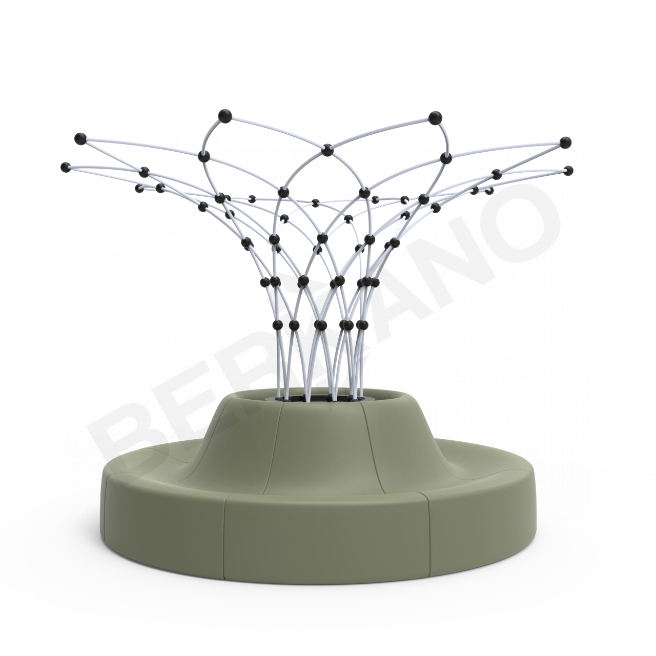 Широкое основание одновременно выполняет роль посадочного места и опоры для живой конструкции. Вьющиеся растения, поднимаясь по каркасу, формируют естественный навес, создающий тень и визуально оживляющий пространство.
